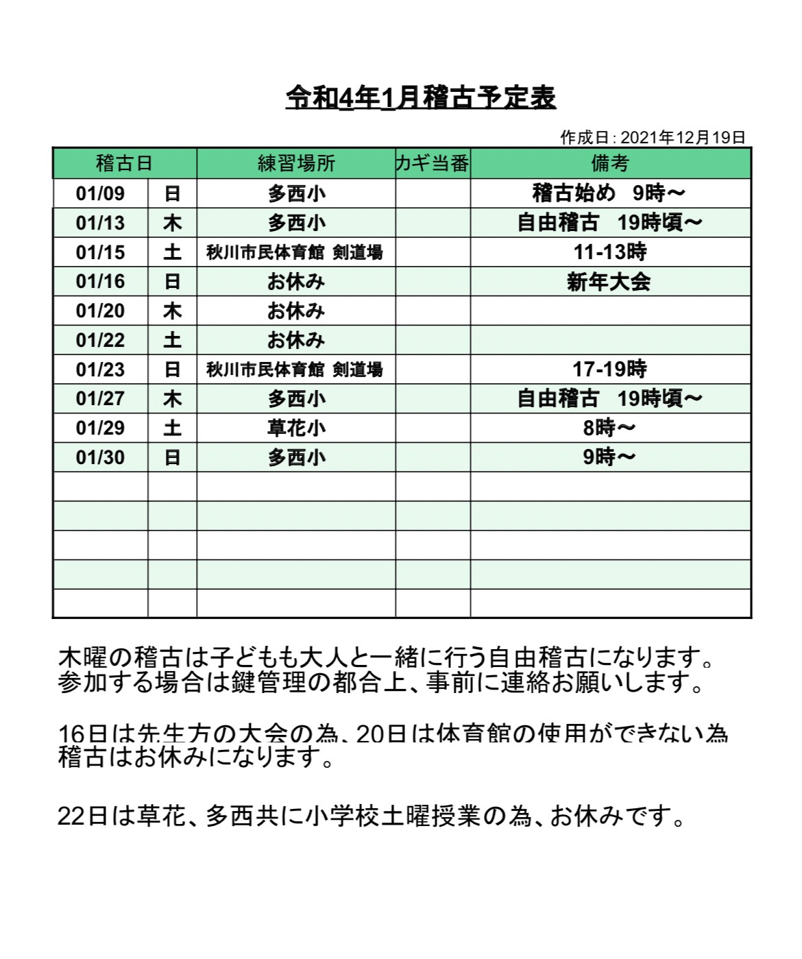 1月稽古予定